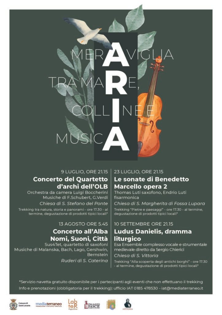 trekking, accompagnati dalle guide abilitate del Labter Tigullio, il centro di educazione ambientale e sviluppo sostenibile del Comune di Sestri Levante, e del MuSel – Museo Archeologico e della Città di Sestri Levante, sono un modo per raggiungere il luogo del concerto in maniera “lenta” ed ecosostenibile, imparando a cogliere dettagli che forse normalmente non si notano e ad apprezzare natura, storia e paesaggio. Sono inoltre pensati in un orario particolarmente affascinante, quello che va verso la fine della giornata, verso il tramonto.