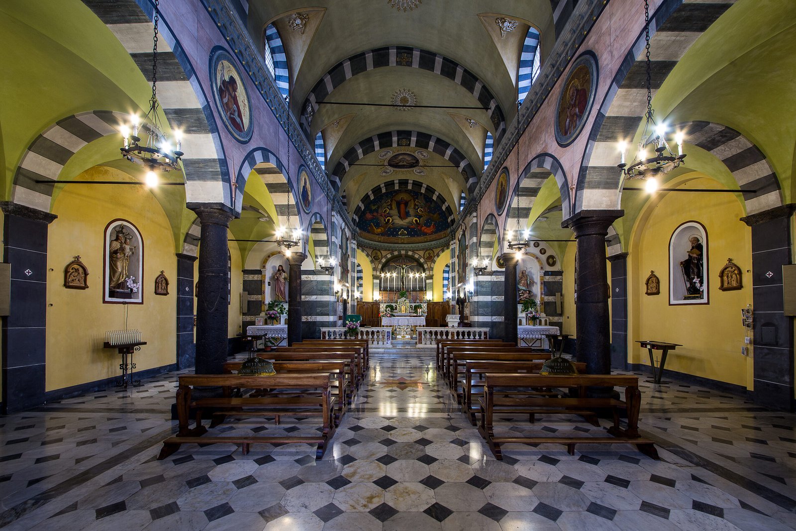 All’interno della chiesa, le navate sono sostenute da colonne scure in ardesia, la parte più antica della struttura, e completate da un pregiato pavimento in marmo. Degno di nota è l’affresco vicino alla vasca battesimale, databile tra la fine del XV e l’inizio del XVI secolo, che raffigura il Battesimo di Cristo, simbolo della devozione e dell’arte sacra della comunità di Allegrezze.