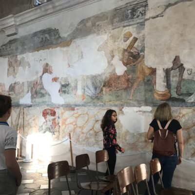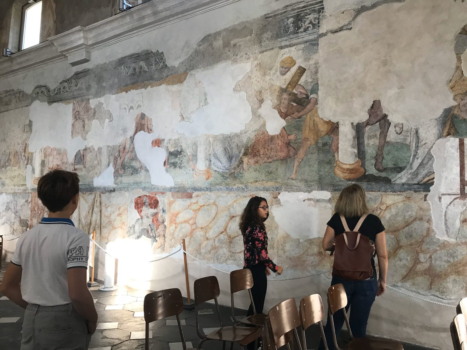Nel corso dei secoli, i confratelli furono costretti più volte a coprire gli affreschi con calce o intonaco, dipingendo nuovi cicli decorativi sopra i precedenti. Oggi questo processo ha lasciato una straordinaria stratificazione: almeno cinque livelli di affreschi, databili tra il 1200 e il 1700. I più antichi, visibili sulle pareti vicine all’altare, mostrano frammenti del Trionfo della Morte e figure di santi. Al secolo successivo appartengono le immagini di San Cristoforo e della Vergine, mentre al Cinquecento risalgono gli episodi della vita della Vergine lungo la parete sud e quelli della Passione di Cristo sulla parete nord, incorniciati da fregi decorati con vasi e delfini.
